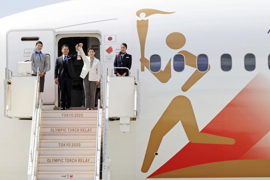 2020年3月20日,日本奥运会柔道冠军野村忠宏(左二)与女子摔跤奥运冠军吉田沙保里(右二)手持圣火火种灯走出机舱。